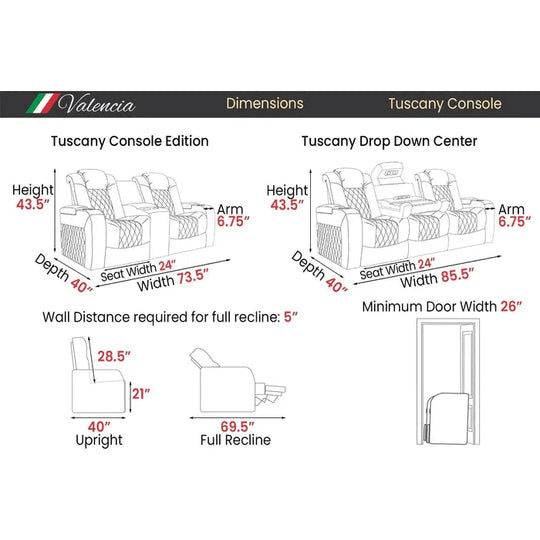 Valencia Tuscany Luxury Console Home Theater Seating Row of 3 Product Description Tuscany Luxury Console Edition is a luxurious upgrade from our Tuscany Console home theater couch. One movie night in this, and you’ll see why...Sale price From $4,499.99Regular price $5,999.00Sale price From $4,499.99Regular price $5,999.00 -