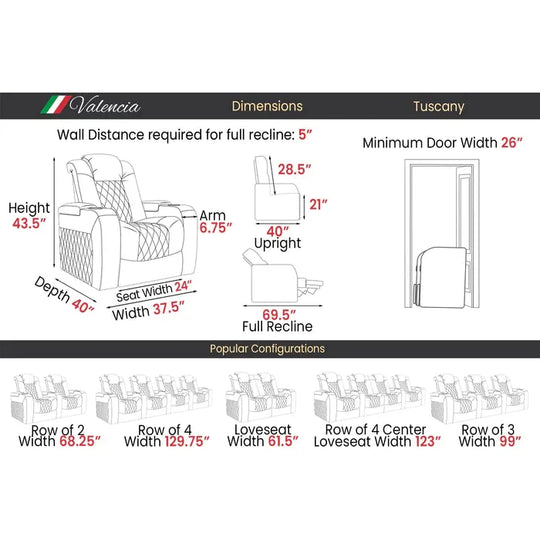 + 3 moreValencia Tuscany Ultimate Edition Home Theater Seating Row of 4 Product Description Experience the Tuscany model intensified. The Ultimate Luxury Edition is the supreme leader of home theater seating. Immerse yourself in luxury with Semi-Aniline Italian...Sale price $7,999.99Regular price $8,999.00Sale price $7,999.99Regular price $8,999.00 -