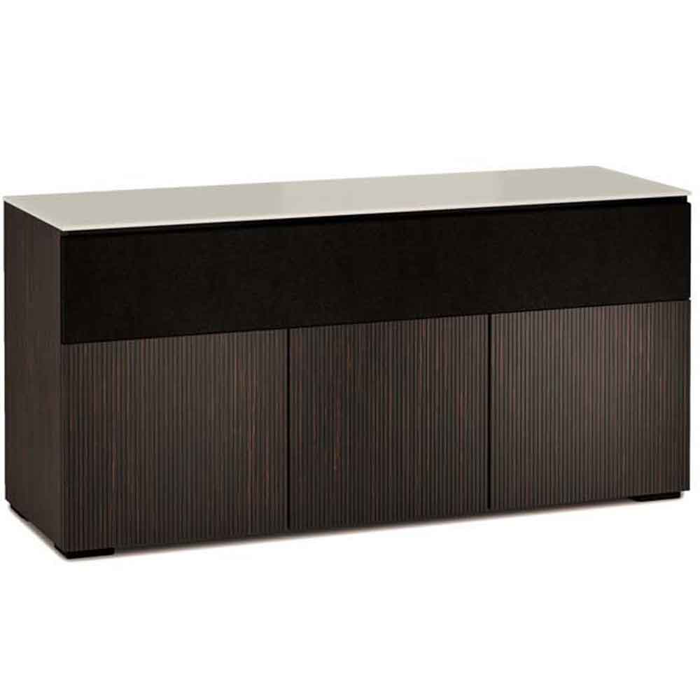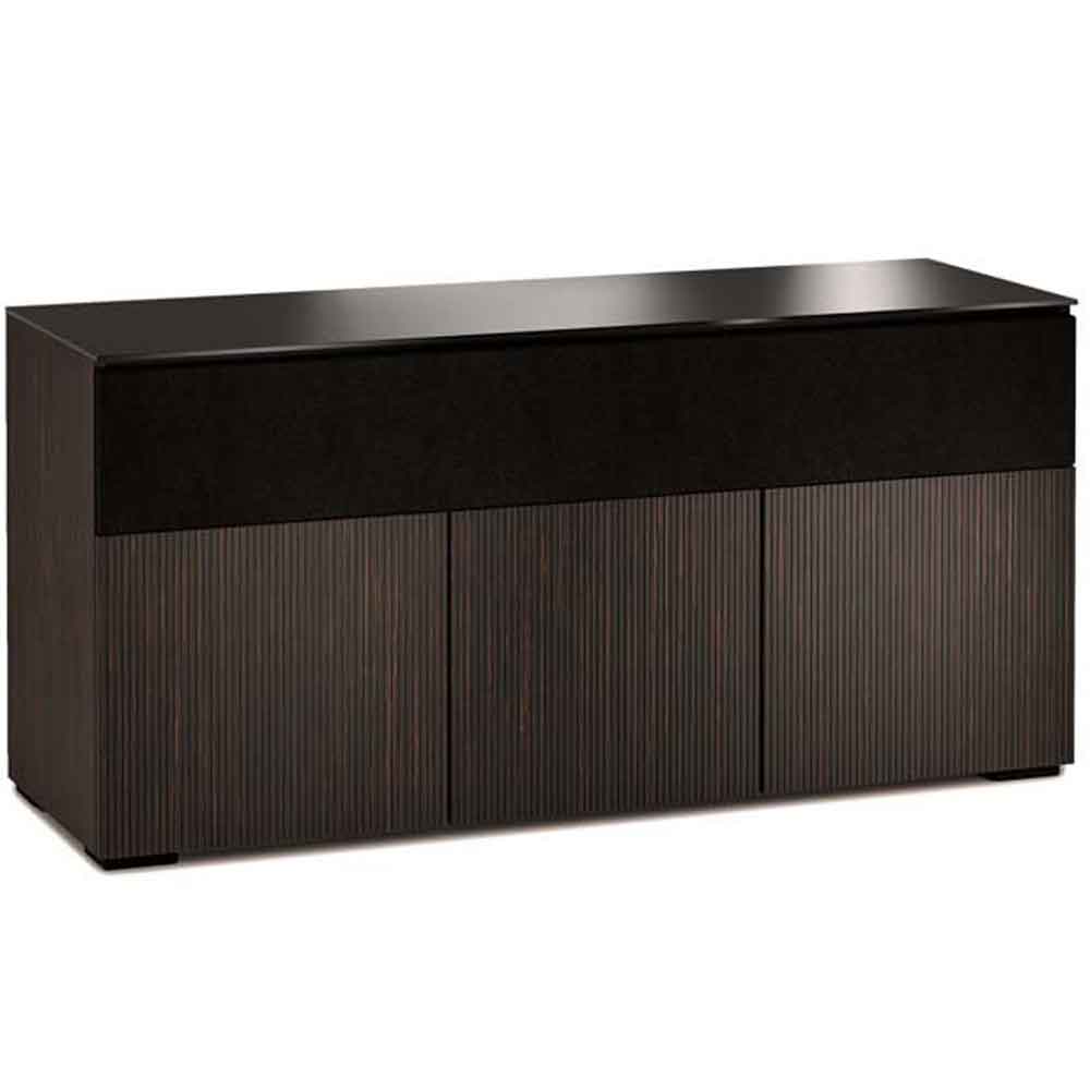 Crafted with meticulous attention to detail, the Manhattan Media Cabinet features a vertical, striped textured pattern in an Ebony Maro or Medium Walnut finish. Taupe Etched Glass Top brings a soft, matte taupe finish that offers a warm, non-reflective surface—simple yet rich in tone and sophistication. The Black Glass Top provides a sleek, reflective surface that delivers a clean, modern aesthetic.
