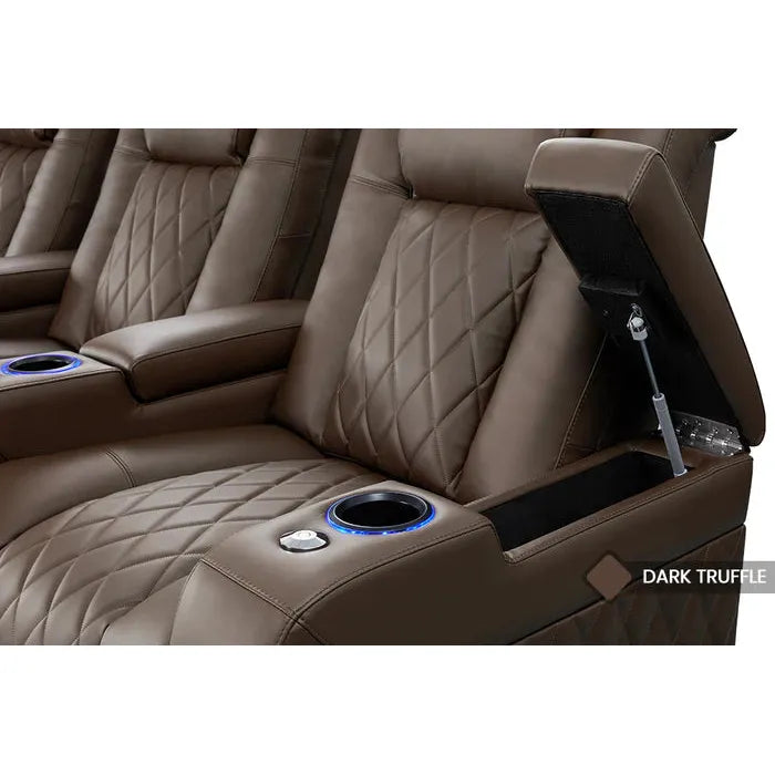 The concealed armrest storage is powered by air pistons for a smoother open & close experience. Hide your remotes and gadgets when not in use